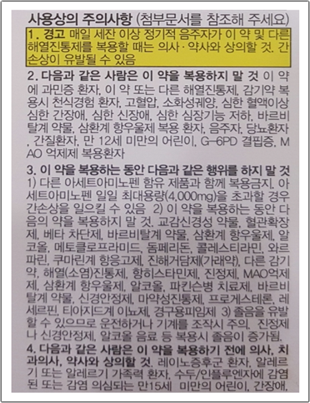 - 이 약 또는 다른 해열 진통제, 감기약 복용